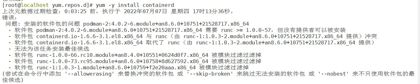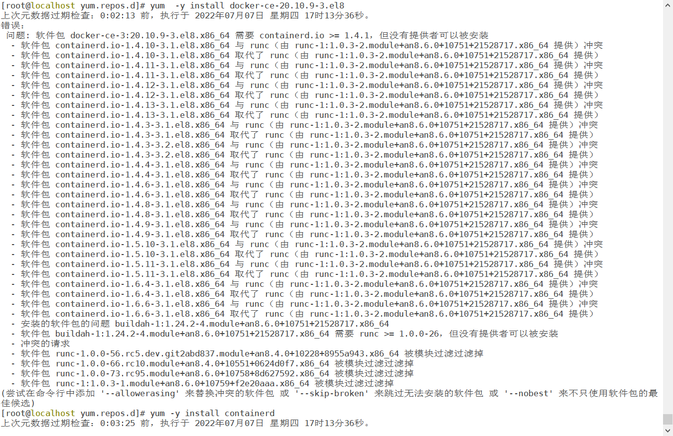 安装的时候报错了,提示docker软件包依赖containerd.io,所以先用yum安装containerd.io