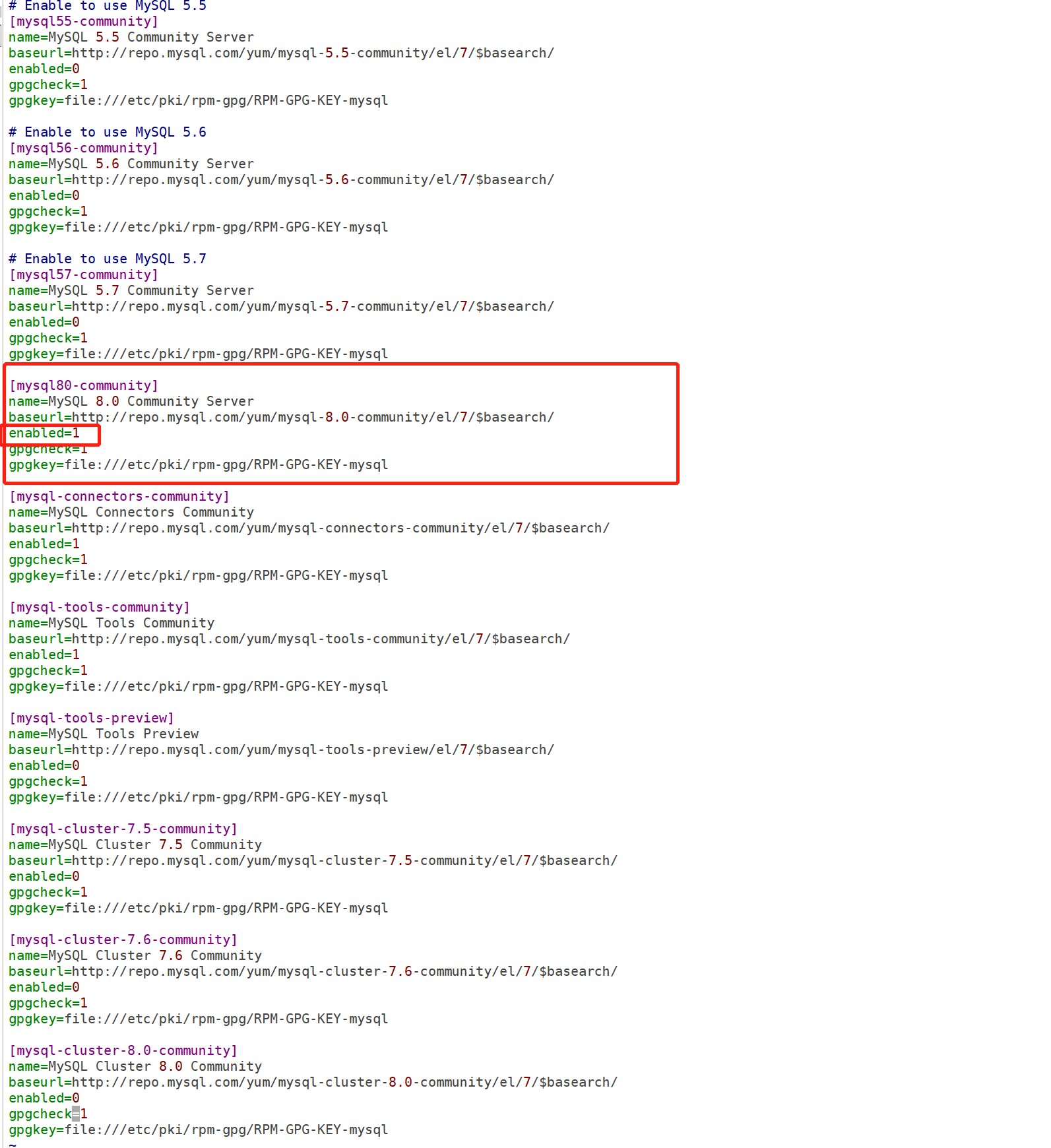 修改MySQL的yum文件,想要安装那个版本的mysql,就使用enbaled=1放开那个版本的即可,我这里安装的是8.0版本的mysql